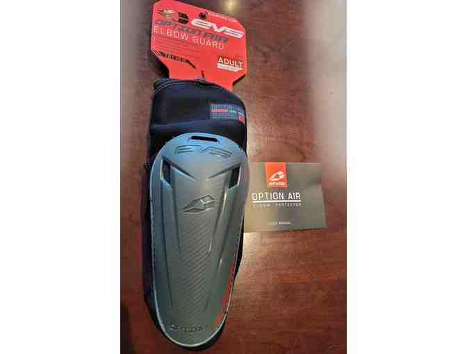 EVS Option Air Elbow Guards provide enhanced functionality, airflow and comfort. Hard molded plastic shell, raised compression technology for venting and comfort. Upper arm and forearm comfort cuff. Velcro straps.