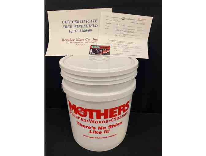 We have a fabulous car lover's package filled with lots of goodies. Let's start off with a bucket full of the finest car wash goodies from C&H Motor Parts - Mothers protectant and wheel & tire cleaner, Mothers car washing soap and foaming glass cleaner, large sponge, and three microfiber towels. Then we've added a $25 gift card from O'Reilly Auto Parts, a gift certificate from Les Schwab for a free alignment valued up to $110 and topping the package off with a free windshield gift certificate valued up to $300 from Breaker Glass.