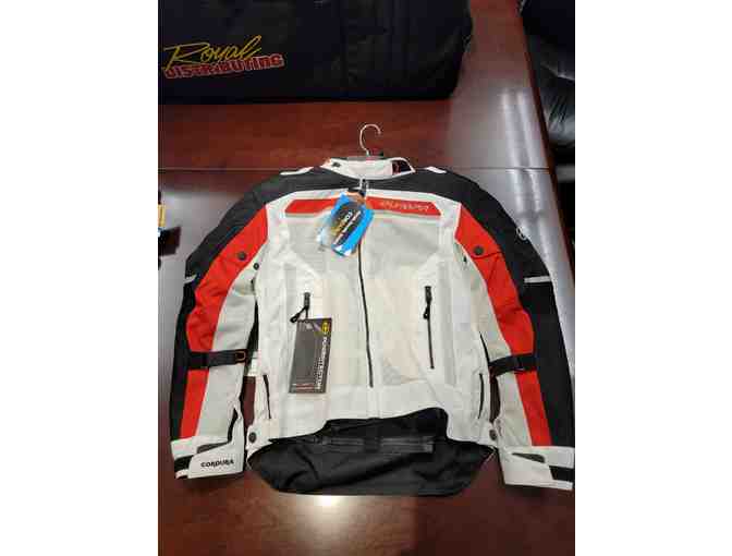 Outer shell constructed in 500D Cordura fabric with ballistic airflow mesh panels. Waterproof, Thermolite insulated two stage over or under rain jacket. Cool mesh airflow lining. 8" connecting zipper for pants. Five storage pockets plus interior cell phone pocket.