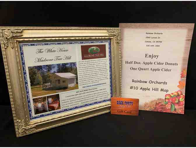 This 2-night stay at one of Apple Hill's finest Airbnb's is the perfect getaway, whether you live close by or far away. Built in 1937, this quaint little house was renovated in 2019 with a beautiful new interior while retaining its exterior charm. Enjoy beautiful views of the meadow and stream off the deck, explore the Apple Hill area, hike on the surrounding trails or check out some of many fruit farms, bake shops, wineries and breweries the located nearby. This package also includes a gift certificate for cider and apple cider donuts from Rainbow Orchards just across the road, and a $100 gift certificate to Back 40 Texas BBQ.