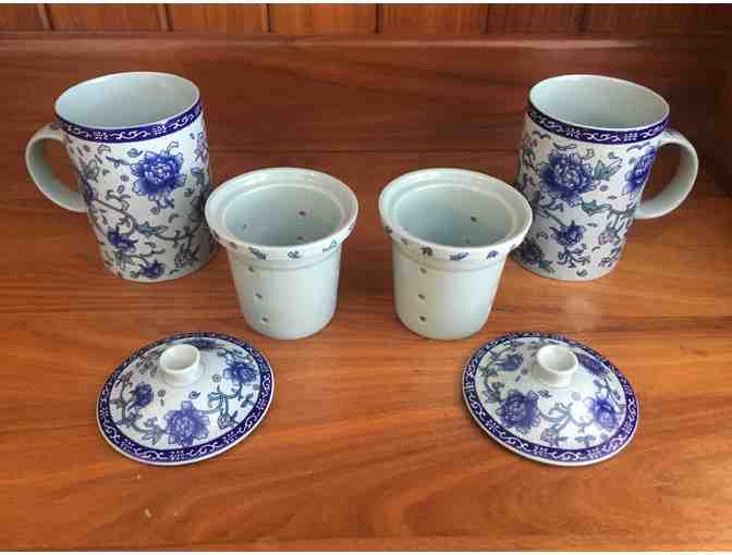 Set of two blue floral patterned Japanese tea mugs with strainers for loose tea and covers for steeping.