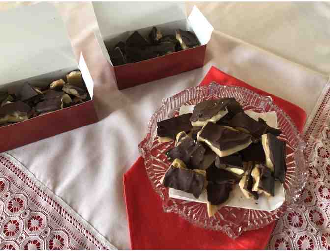 Homemade chocolate almond crunch candy.
