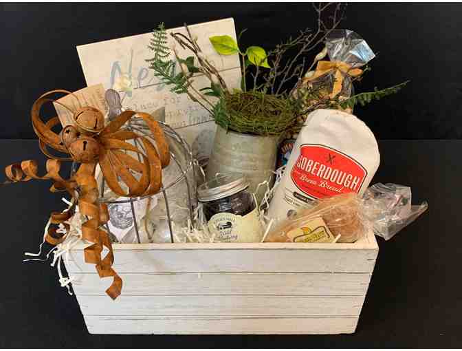 This delightful box is a treasure-trove of goodies courtesy of Under the Arbor and includes décor and yummy treats to eat. Décor items include a "nest" plaque, a watering can with bird nest, a bird cage with eggs, a metal bow with bells, and Sugar Maple candles. And the treats to eat include Pumpkin Spice Sourdough Bread Mix, Cinnamon Toast Carmel Corn, Wild Blueberry Jam.