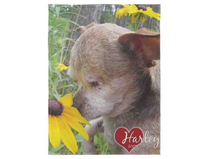 The 'Harley and the Sunflower' fleece blanket was custom-made for our auction. It is printed from one of Harley's most beloved photos. The sunflower is a symbol of hope and survival; it has become forever associated with Harley by his supporters. There is a red heart on the lower right of the blanket with Harley's name and life date.