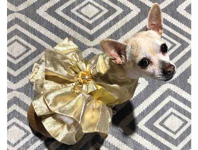 Beautiful handmade gold lame dog dress for small dog. 9" long. Adorned with a striking bow that includes a sunflower center and gold beads. Includes 'D' ring to attach a leash.