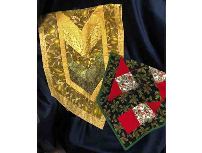 Bring a pop a color to your table year round with this pair of reversible quited table runners.  One is yellow and green and features pears, the other is red and green and feature Northern Cardinals (Cardinalis cardinalis).
