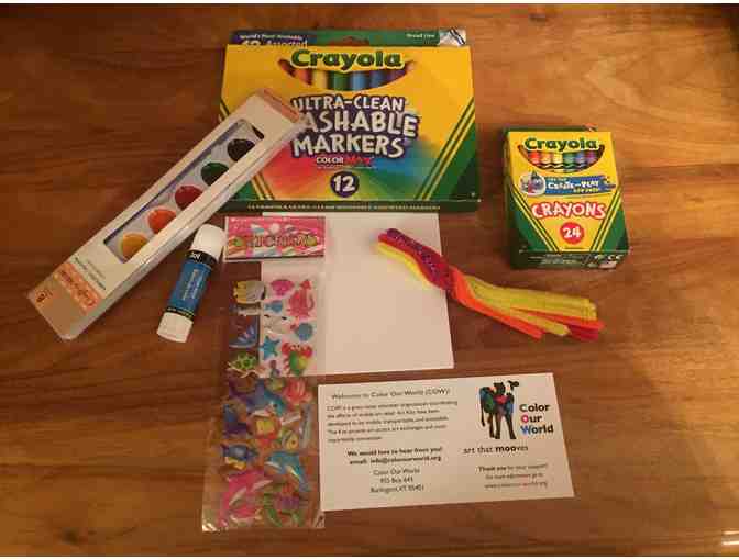 Supplies for color and craft activities. Donated by "Color Our World" (COW). COW is a grassroots volunteer organization coordinating the efforts of mobile art relief. Art Kits have been developed to be mobile, transportable and accessible. The kits provide art access, art exchanges and most importantly, connection.