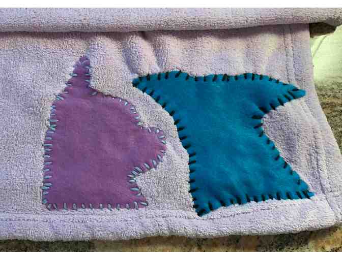 Lovely lilac-colored plush fleece blanket with blanket-stitched silhouettes of Harley and Teddy, as well as a sunflower. Great blanket to snuggle in! Handmade.