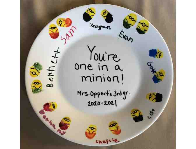 "You're One in a Minion" plate handpainted with all the fingerprints of Mrs. Oppert's 3rd graders.