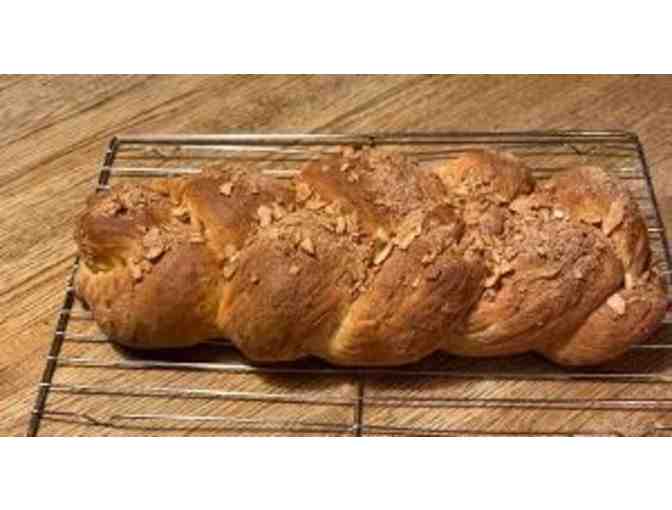One loaf of bread. A rich and delicious traditional Swedish cardamom bread lightly dusted with cinnamon, sugar and flakes of almonds. Great toasted for breakfast, with jam at afternoon tea or as a light dessert.