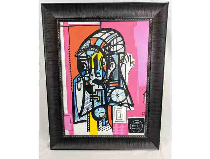 James Peter Henry, the Australian-born, US-based artist influenced by Cubism, African and Aboriginal art has created this extraordinary painting entitled “The Forth Dimension.” Vibrant colors including pink, orange blue and yellow are accented with black and white creating a Cubist inspired dream. Framed in black, this gorgeous 24” x 17” acrylic on canvas artwork is ready to adorn a place of honor in your home.