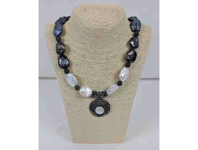 Glam up any outfit with this gorgeous Baroque coin pearl necklace. This 22" necklace features 16 large Baroque coin pearls in white, chocolate and grey. A sterling silver and mother-of-pearl pendant anchors this elegant piece. The sterling silver toggle makes it easy to take off and put on. Add classic elegance to your ensemble with this wonderful necklace. The Crazy Merchant, Littleton, Colorado