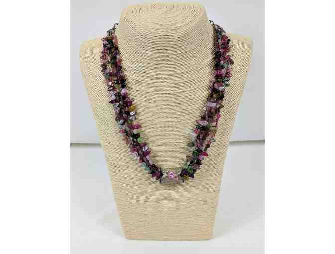 Bring stunning style to your ensemble with this extraordinary necklace from The Crazy Merchant in Littleton, Colorado. five strands of yummy watermelon tourmaline gemstones come together with a sterling silver centerpiece designed by Santame. This stunning statement piece is 22" long with an adjustable S-hook closure.
