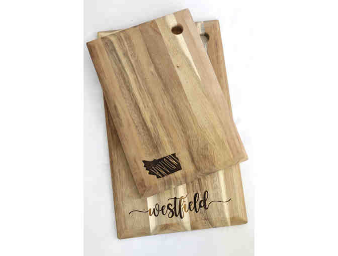 Show your local pride in your kitchen and entertaining with this 2 custom engraved cutting boards. Made from Acacia wood these cutting boards measure 8 in by 12 in and 9 in by 15 in. They would make a great board for your next charcuterie tray! Hand wash and dry for best results.