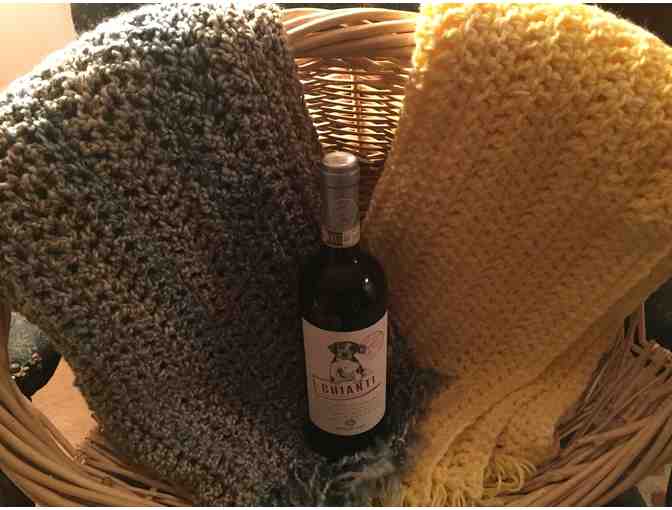 Two Handknit Prayer Shawls (20" x 60") and a bottle of Chianti (750 ml) - all to promote luxury and comfort.