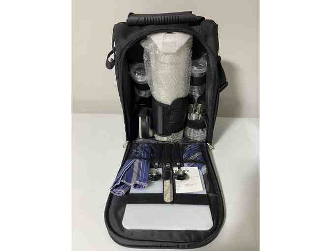 This insulated bag also contains- 2 stainless mugs, hot / cold thermos, cutting board, 2 spoons, 1 knife, 2 cloth napkins and 2 containers