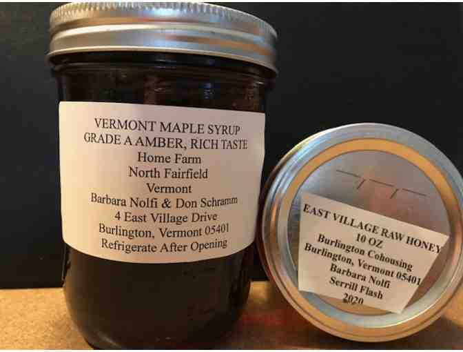 A sixteen ounce jar of Grade A Amber Vermont Maple Syrup and a ten ounce jar of East Village Raw Honey. A super sweet combination.
