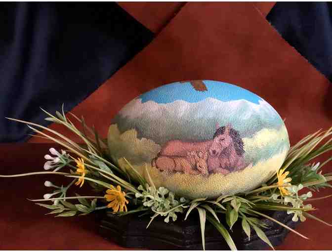 A beautiful wild horse scene is featured on a painted emu egg. The mare watches closely, but calmly, over her sleeping foal. The herd plays in the valley below. The red-tailed hawk gazes from above, celebrating the freedom and joy of springtime.