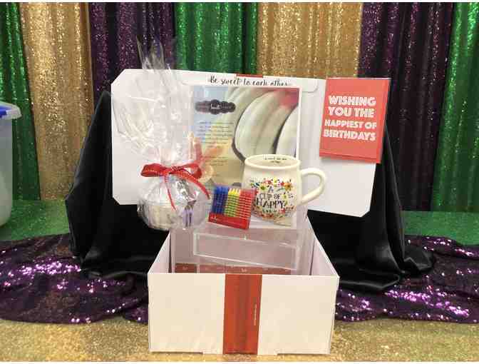 THIS IS A BIRTHDAY BOX WITH CERTIFICATE FOR CAKE, HAPPINESS MUG CANDLES AND HAPPINESS NAPKINS
