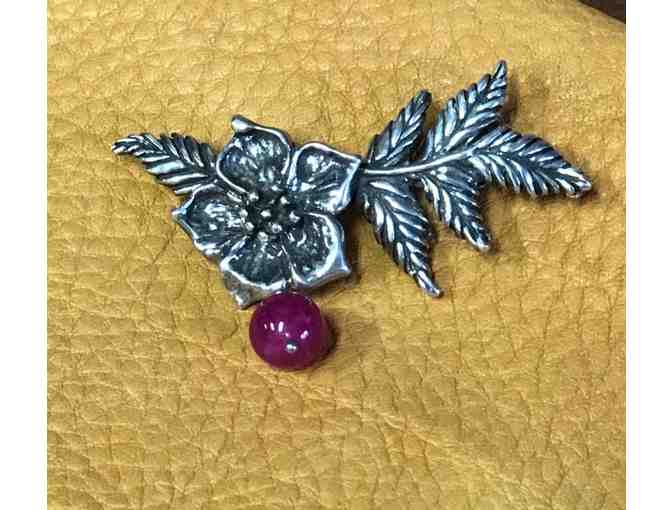 Sterling Silver Pin created with the lost wax casting process. High quality rose quartz bead dangling from rose.