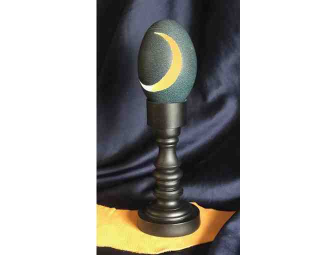 The deep, rich dark of the Emu egg brings a sliver of glow from the cresent moon shines love and light in your room.  Eggs are a symbol of love and new beginnings.