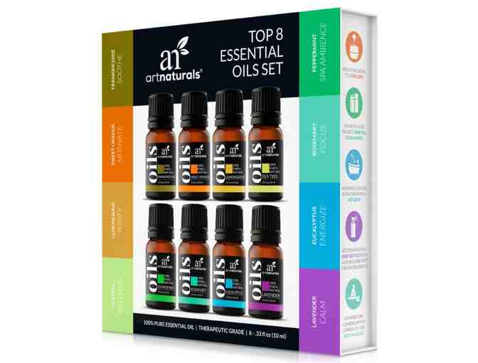 The package contains 8 pure, therapeutic grade essential oils - perfect for aromatherapy, cleaning the air, and making your own homemade bath and body, cosmetic, and household cleaning products.