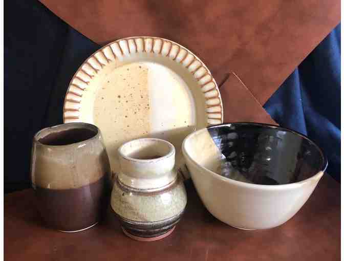 Earthen hued cookie jar with lid and vase for the blooms of the season + Crock, Bowl, Plate, Cup, all in brown/natural glaze. Plate is 10.5" round. Ceramics are a durable and beautiful addiiton to any home!