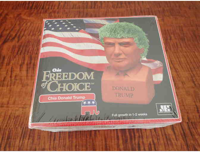Contains handmade Chia Donald Trump planter, Chia seed packet for three plantings, convenient pastic drip tray, and planting and care instruction sheet. Achieves full growth in one to two weeks.