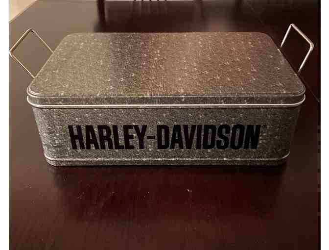Metal box with compartments for Harley Davidson. Donated by Old Fort Harley Davidson.
