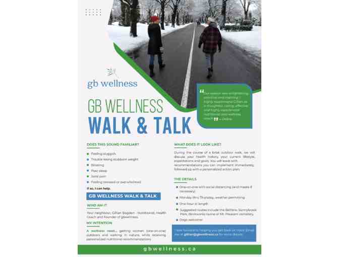 During the course of a brisk outdoor walk (social distancing in effect), we will discuss your health history, your current lifestyle, your expectations and goals.