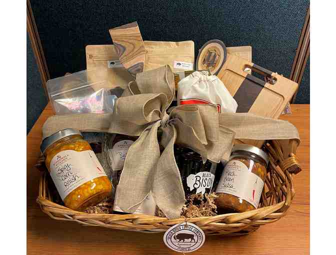Black Bison Basket includes: 3 bags 14oz Black Bison coffee, 3 Pakka spoons, 1 spicy corn relish, 1 black bean salsa, 2 Black Bison tea, 1 rewined candle, 1 soberdough, 1 concord grape jelly, 1 bellini jam, 1 mini cheese board, 1 Black Bison coffee mug.