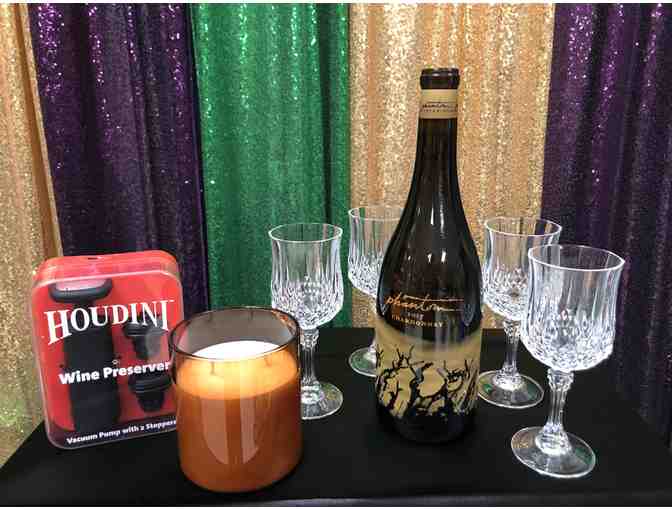 4 WINE GLASSES BOTTLE OF CHARDONNAY PHANTOM WINE