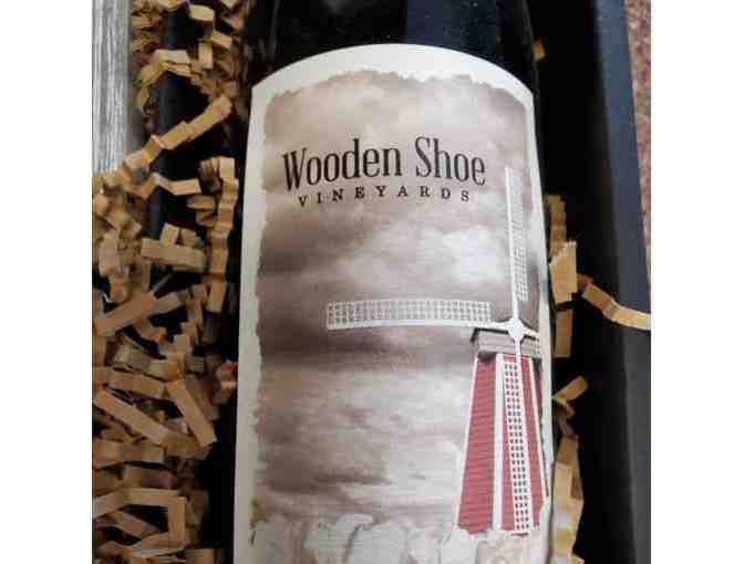 Wooden Shoe Vineyards 2018 Sparkling Albariño Wine. Grown in the Willamette Valley of Oregon. Ceramic Rooster Salt and Pepper Shakers Barn wood painted rooster