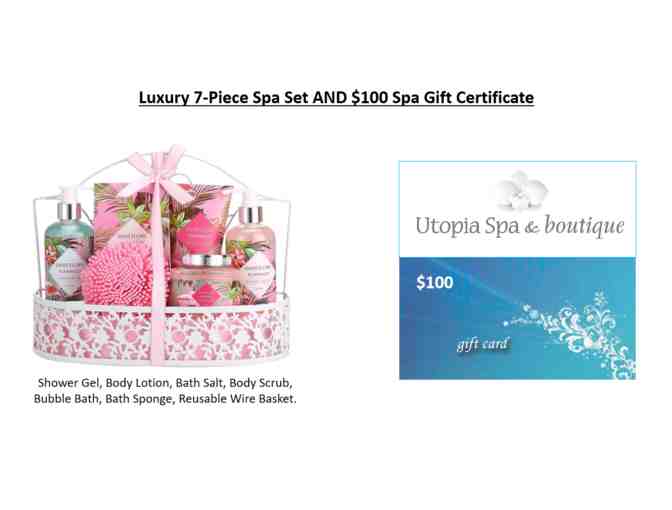 Luxury 7-Piece Spa Set (Shower Gel, Body Lotion, Bath Salt, Body Scrub, Bubble Bath, Bath Sponge, Reusable Wire Basket) and $100 Spa E- Gift Certificate at Utopia Spa & Boutique in Milton.