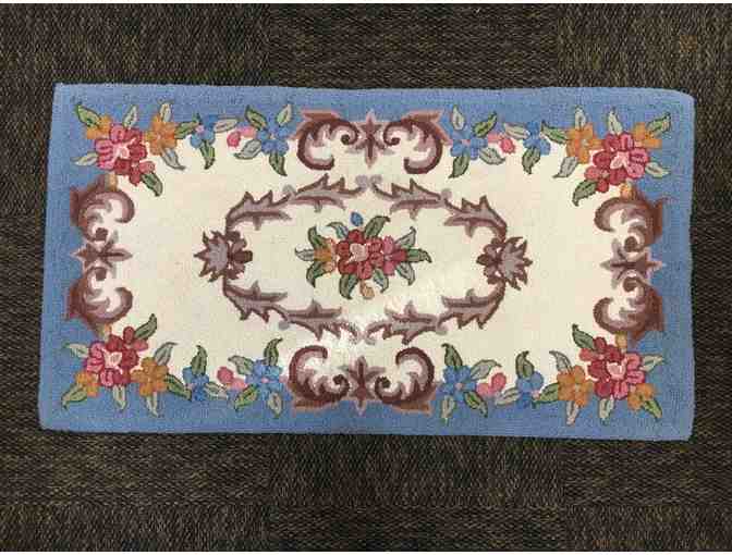 Nice patterned area rug for use almost anywhere. 5'0" X 6'9", Blue border around a flowered center.