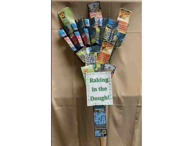 Plastic yard rake with a variety of scratch off lottery tickets. Who knows, you may just rake up a jackpot!