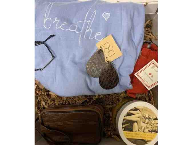 Randoon's and Co Gift Box and $15.00 Gift Card includes, earrings, bracelet, candle, t-shirt, body scrub, passport and wristlet.