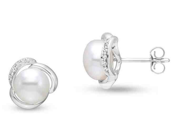 These 14k white gold pearl stud earrings feature 8.5-9mm white button freshwater pearls accented with 12 diamonds set in a petal design.