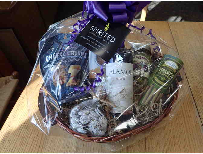 Yummy gift basket prepared by Spirited that includes wine, cheese crisps, coconut macaroons, Tiramisu rolled wafers, pickle chips, and chocolates.