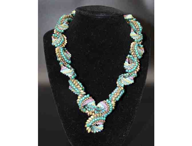 Gorgeous turquoise, blue, gold, rose, and silver 18-inch hand-beaded necklace with a beautiful 1-inch beaded loop in the center.
