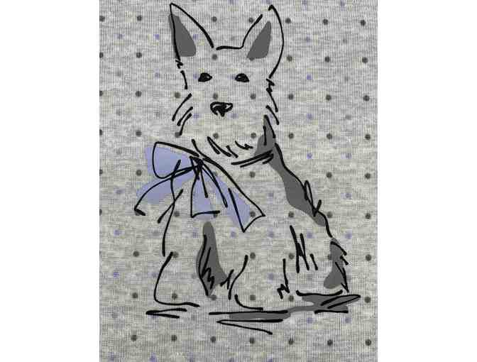 Face your night in comfort and style with a classic Laura Ashley puppy dog nightshirt. The light grey soft Hacci knit nightshirt is screen printed with delicate periwinkle and dark grey polka-dots all over and an adorable white Scottie dog sitting pretty with a periwinkle bow around her neck. The round neckline is accented with a soft periwinkle trim and the short sleeves make this pajama tee perfect for sleeping or lounging.