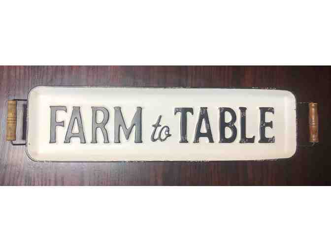 This package includes a 27.5"x7" metal Farm to Table tray with wooden handles and brackets for hanging.