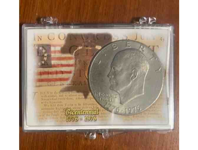 The Eisenhower dollar was a one-dollar coin issued by the United States Mint from 1971 to 1978; it was the first coin of that denomination issued by the Mint since the Peace dollar series ended in 1935. The coin depicts President Dwight D. Eisenhower on the obverse, and a portrait of the Liberty Bell in front of the Moon to celebrate the 200th anniversary of the United States of America and President Dwight D. Eisenhower's work in starting the US Space Program which led to the Apollo 11 Moon landings.