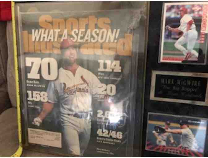 Up for bid is a Mark McGwire plaque measuring 12 inches high x 15 inches wide. Mounted on a wooden plaque with a marbled texture is a Sports Illustrated magazine dated October 5, 1998, a name plate saying "Mark McGwire, The Big Bopper, St. Louis Cardinals", a Donruss card and an additional Mark McGwire card.