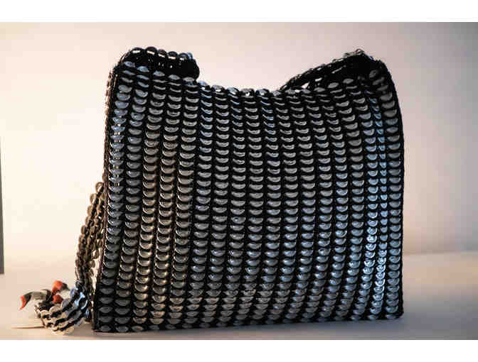 Stylish and eco-conscious handbag hand-made by Good Girl Ella out of repurposed pop-top tabs. Who knew recycling could be so hip?