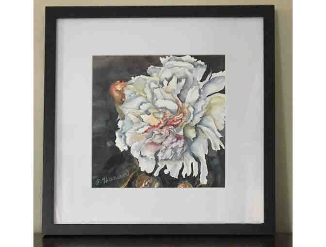A 7 1/2" by 7 1/2" watercolor matted & framed (black) to a 13" by 13" size.