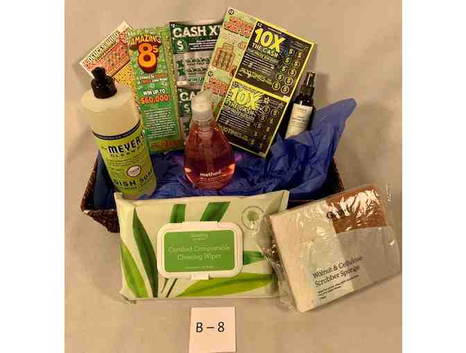 Cleaning up your act? Meyer's dish soap, Method hand cleaner, wipes, walnut scrubber, hand sanitizer spray and several scratch off tickets!