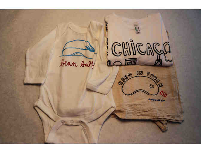 The perfect package for any Chicago kid: an adorable Bean onesie and burpcloth from Rhymes with Twee, a Chicago-themed tee (size 10) that your child can color themselves from SoSilly Stuff, and a gift card from Enjoy: Urban General Store (Andersonville or Lincoln Square location) for more kid stuff or a treat for the parents!