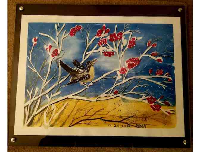 The magpie & plum blossom represent beauty & happiness. An enchanting 15"x11" watercolor in a simple, modern glass frame.