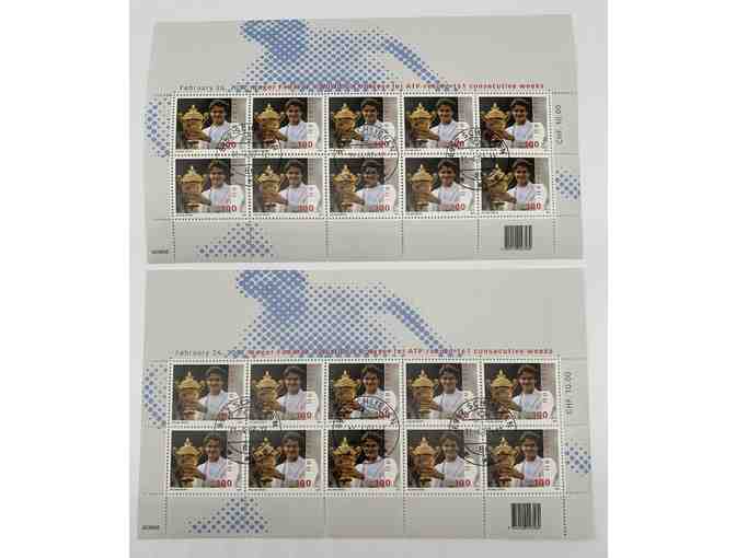 The lot includes 2 sheets (10 stamps each) of the 2007 Roger Federer ATP Commemorative Swiss Mail Stamp with 1st day release stamps dated February 26, 2007.